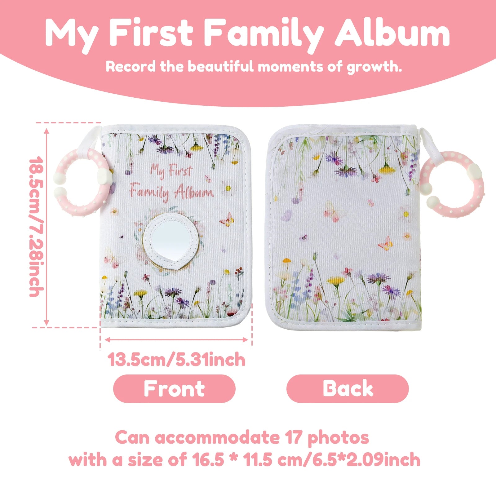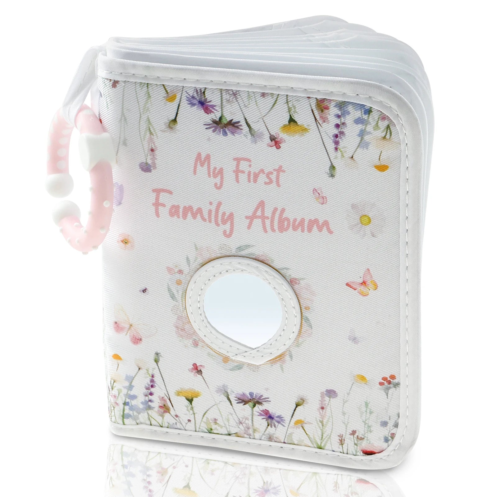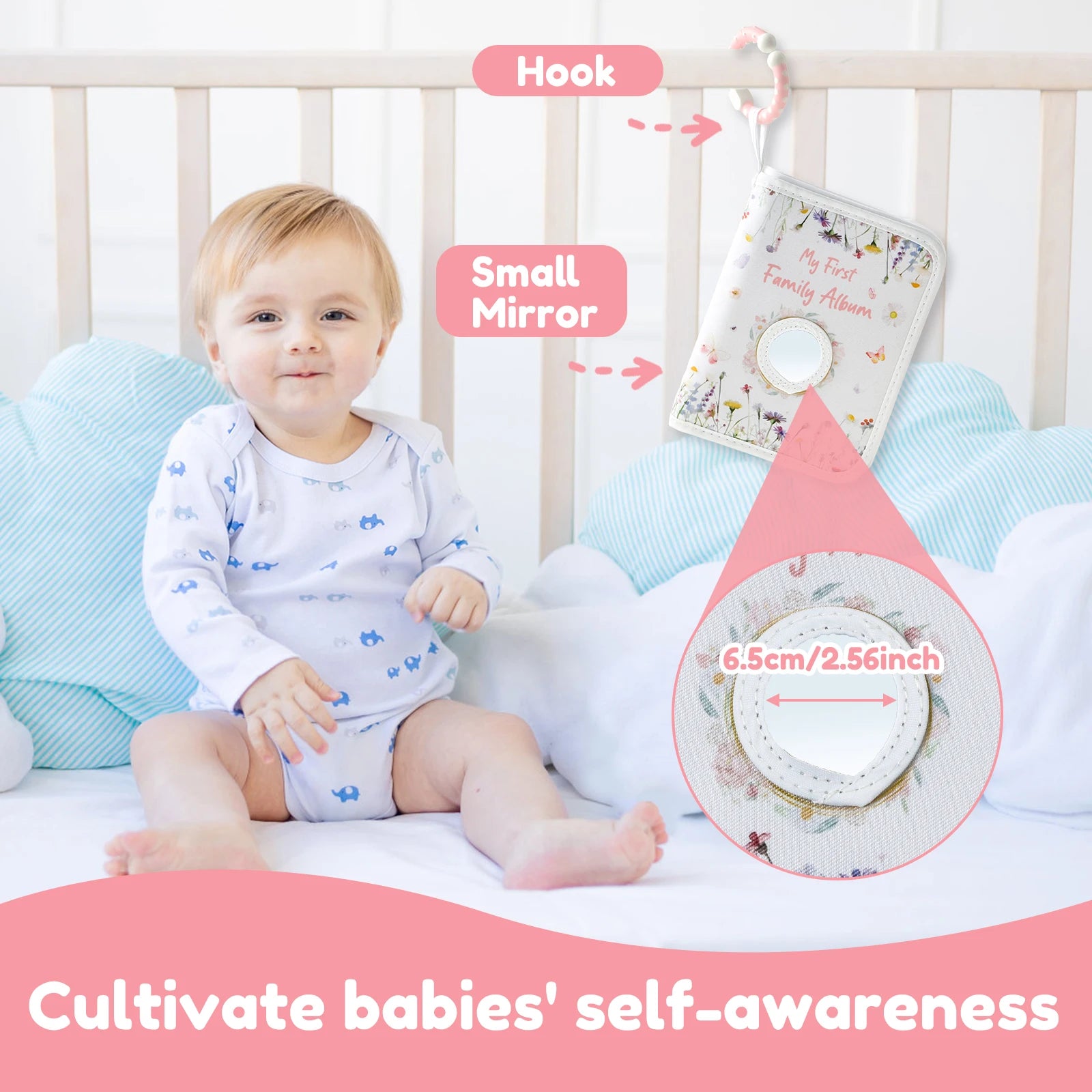 Thoughtful Design: The photo album is equipped with a hook, which can be easily attached to other items such as cot, pram, etc., and is not easy to lose. In addition, the last page of the album also has a 6.5 cm inner diameter child safety mirror in the middle, which not only increases the fun, but also helps to develop the baby's self awareness.